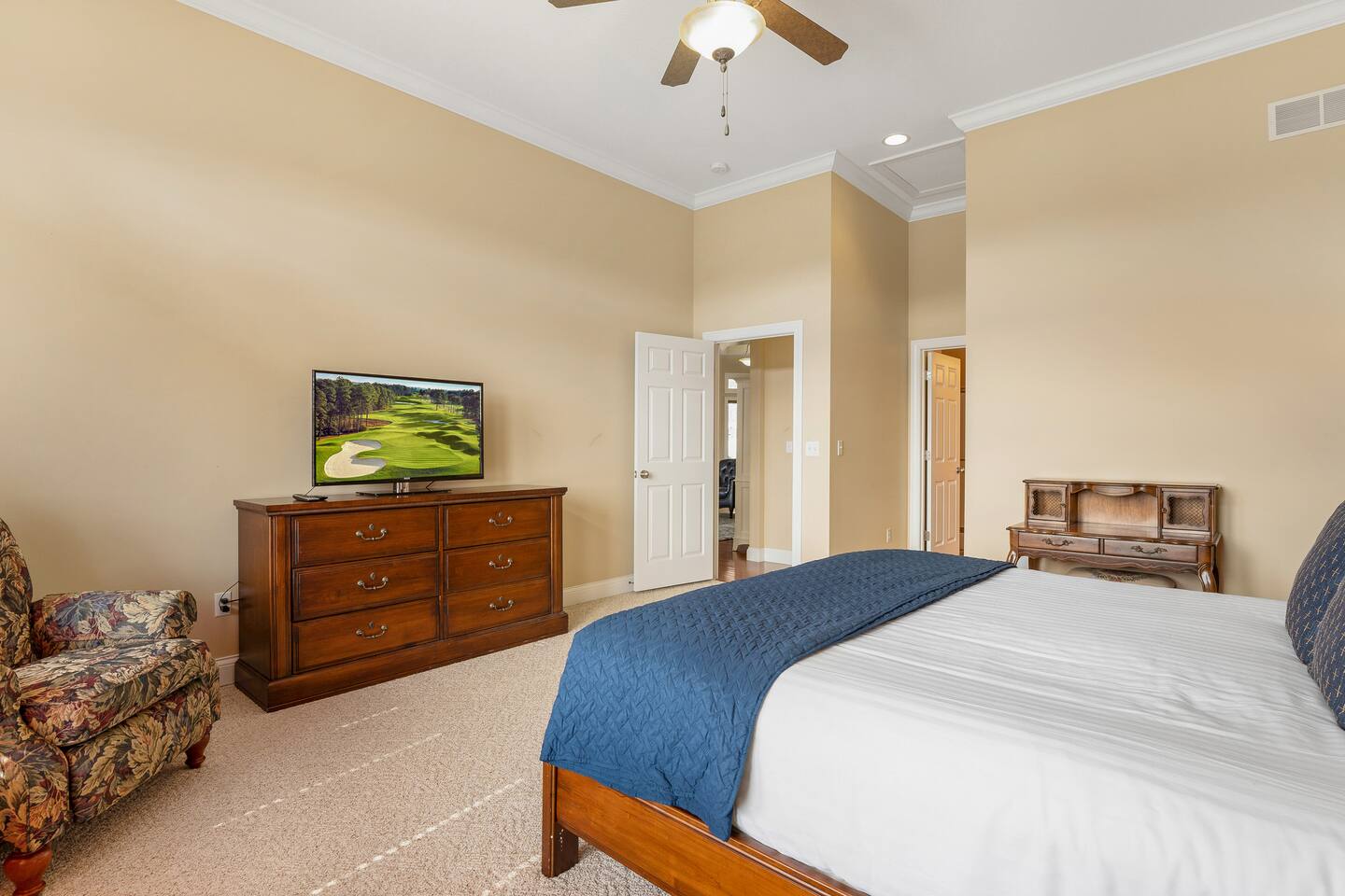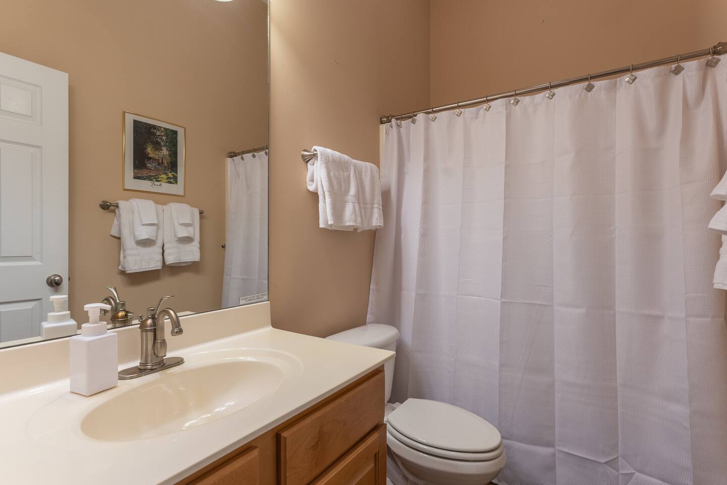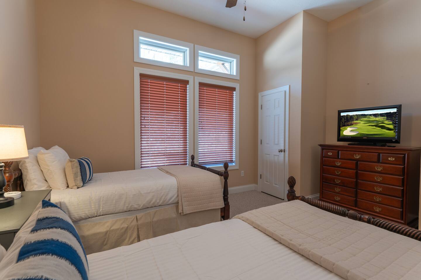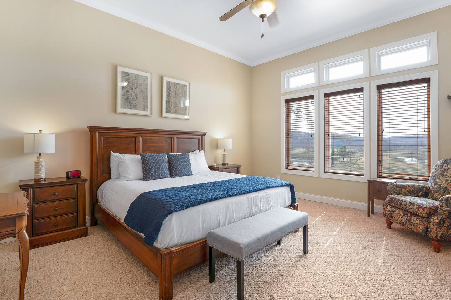This clean and inviting home has 2300+ sq ft (sleeps10) and has everything you need for a fun and relaxing getaway with friends or family! The open floor plan has one level to enjoy your time together. A personal golf cart is provided for convenient trips around the resort to visit the pool or clubhouse (cart is for neighborhood use only, cannot be used on the golf course). Our beautiful 4 bedroom 4 bathroom private home is located on the beloved 9th fairway and across the street from the clubhouse pool. The house includes all the comforts of home. The main level includes 4 bedrooms (1 King, 1 Queen, 2 Doubles and 2 Twins), four full bathrooms, laundry room, kitchen, dining, living room, and screened porch with a grill and outdoor seating. There is a TV with streaming capabilities in the living room and additional TVs in each bedroom. The entry off the 3 car garage is equipped with a Washer and Dryer for your use. WiFi is included in your rental at no additional cost. The deck has seating options for you to enjoy the views and watch the golfers below - the perfect place to relax and have a drink, read a book, or play a game! Guests have full access to resort amenities and Stay and Play rates at Osage National Golf Course.