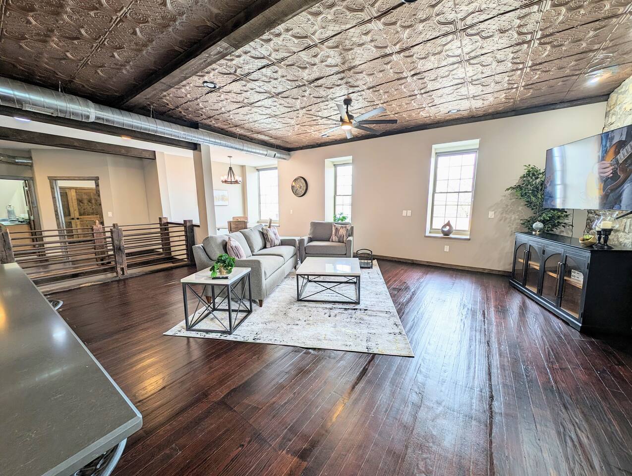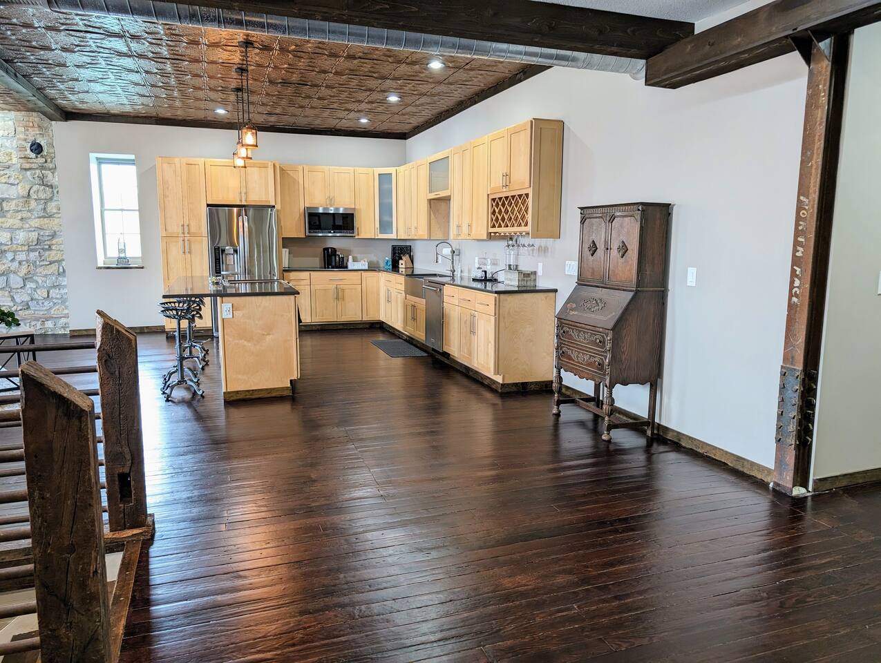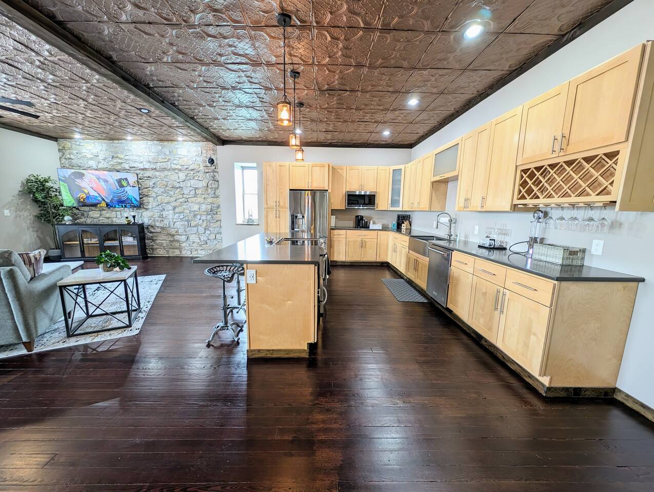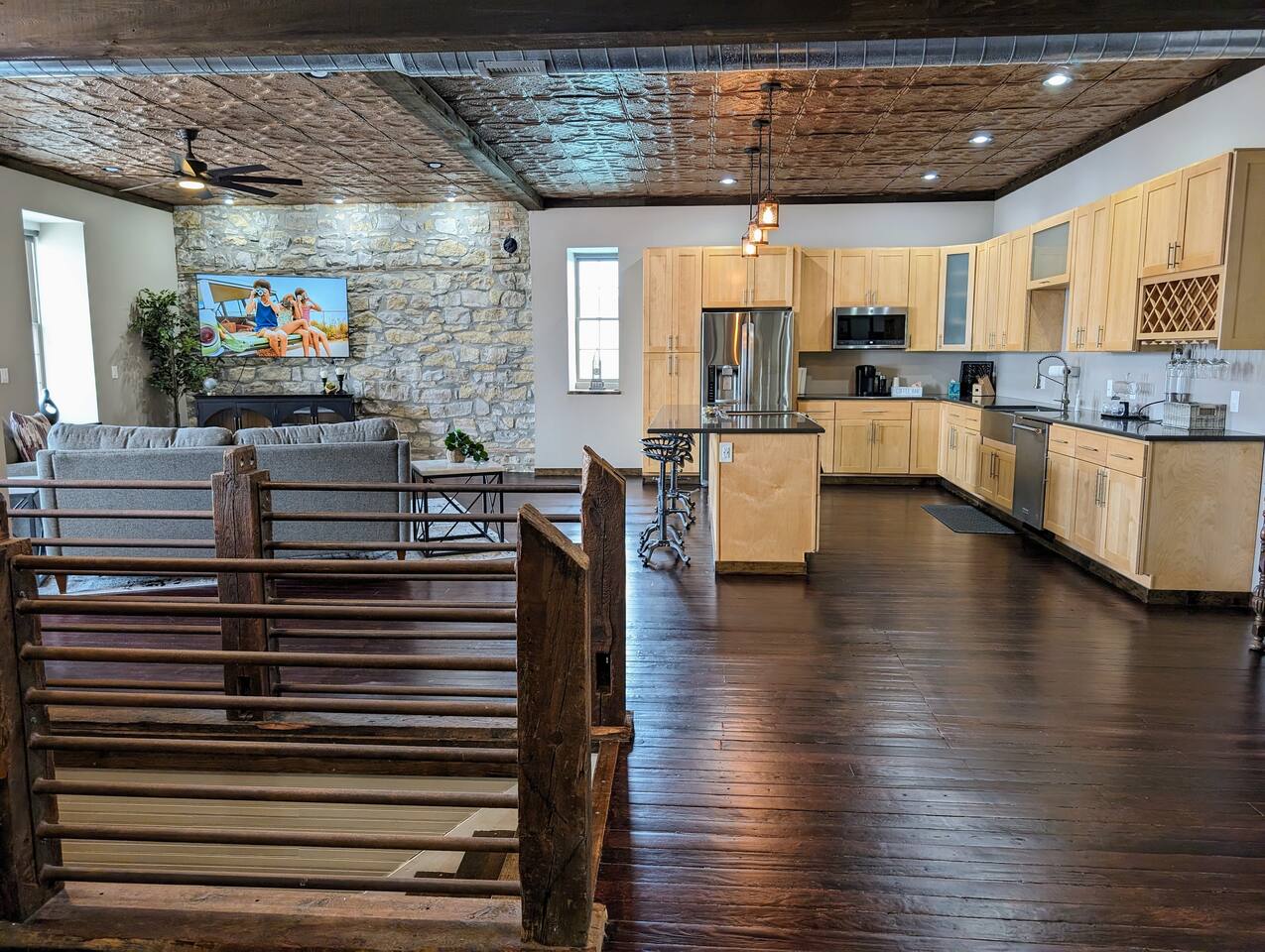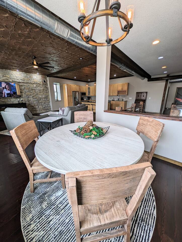 As you step inside, you're immediately greeted by the rustic elegance of exposed limestone walls and warm wood floors that whisper tales of days gone by. The high tin ceilings add a touch of grandeur, accentuating the spaciousness of the loft. Boasting two bedrooms and one bath, this loft offers a sanctuary for weary travelers or those seeking a retreat from the hustle and bustle of everyday life. The first bedroom, adorned with a sumptuous king bed and a twin over twin bunk bed, invites you to sink into its plush linens for a restful night's sleep. A large closet provides ample storage space, while a television offers entertainment at your fingertips. The second bedroom echoes the luxurious comfort of the first, with another king bed, a television, and a generous closet. Entertainment options abound in this historic haven. Two living rooms cater to different moods and activities, with one serving as a cozy retreat adorned with opulent furnishings, perfect for lounging and intimate gatherings. The other living room doubles as a game room, complete with a projector for movie nights and a thrilling array of arcade games including a classic Pacman machine and a basketball shooting game. Whether you're a gaming enthusiast or simply seeking some lighthearted fun, this space promises endless amusement. The front living room seamlessly flows into the open kitchen and dining area, creating an inviting space for socializing and culinary delights. The kitchen is a chef's dream, fully equipped with modern appliances and a large floating island with seating for four, where guests can gather to chat or indulge in delicious meals prepared with love. From casual breakfasts to gourmet dinners, this kitchen is sure to inspire culinary creativity. Convenience meets functionality with the inclusion of a dedicated laundry room, ensuring that chores are a breeze even during your getaway. Throughout the loft, thoughtful touches and attention to detail abound, making every moment a pleasure. Whether you're exploring the historic charm of the surrounding town, testing your luck at the nearby casino, perfecting your swing at the golf course, or unwinding by the tranquil shores of the nearby lake, your stay is sure to be an unforgettable experience, leaving you longing to return time and time again.