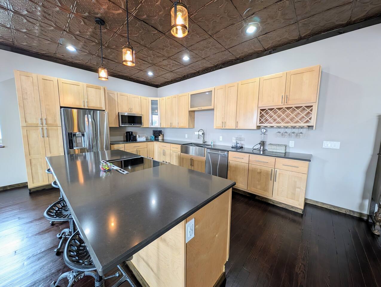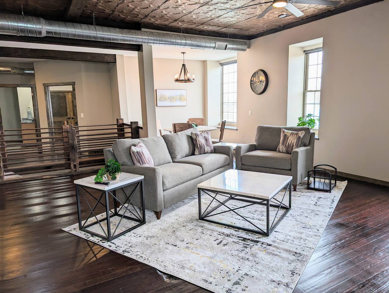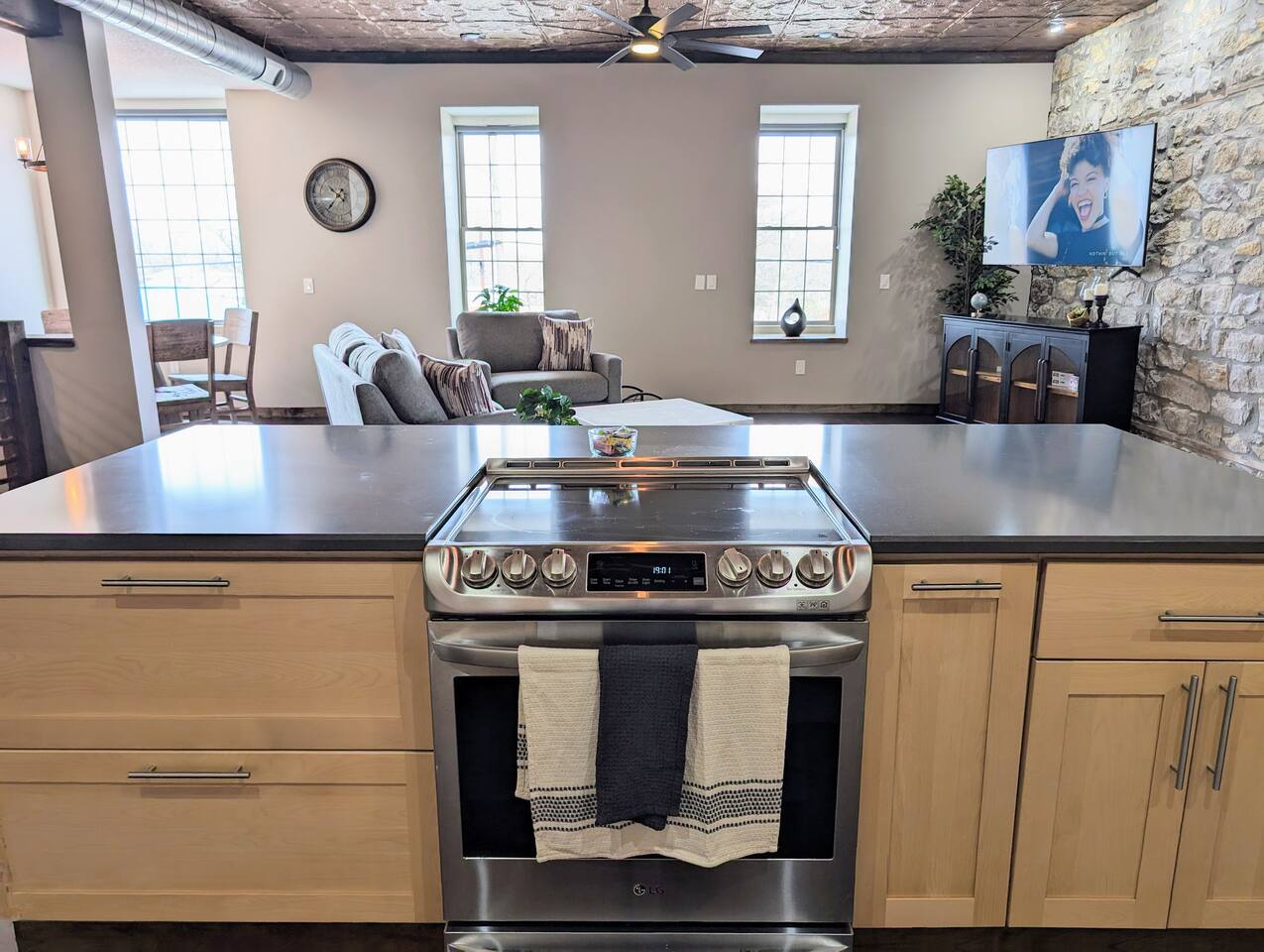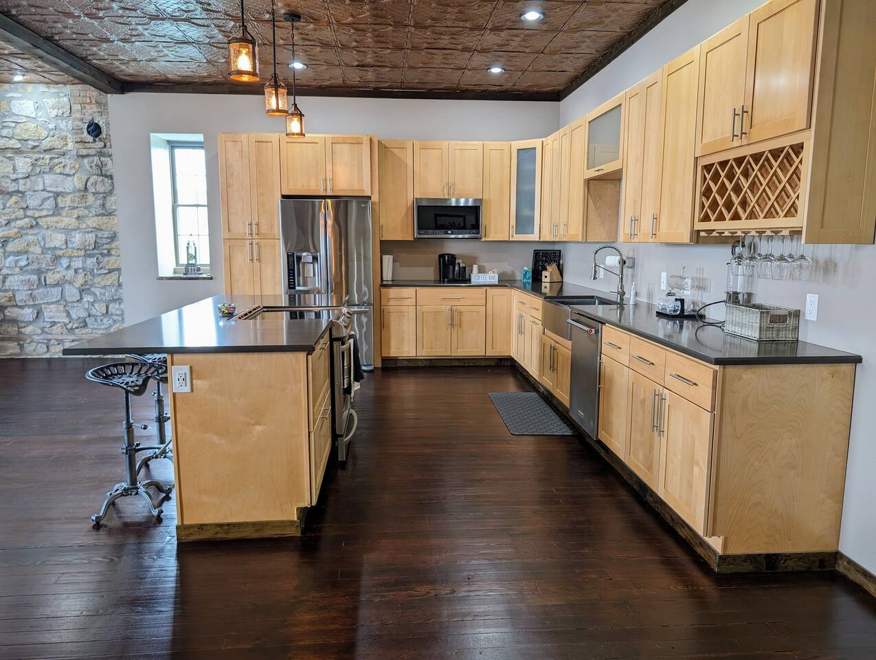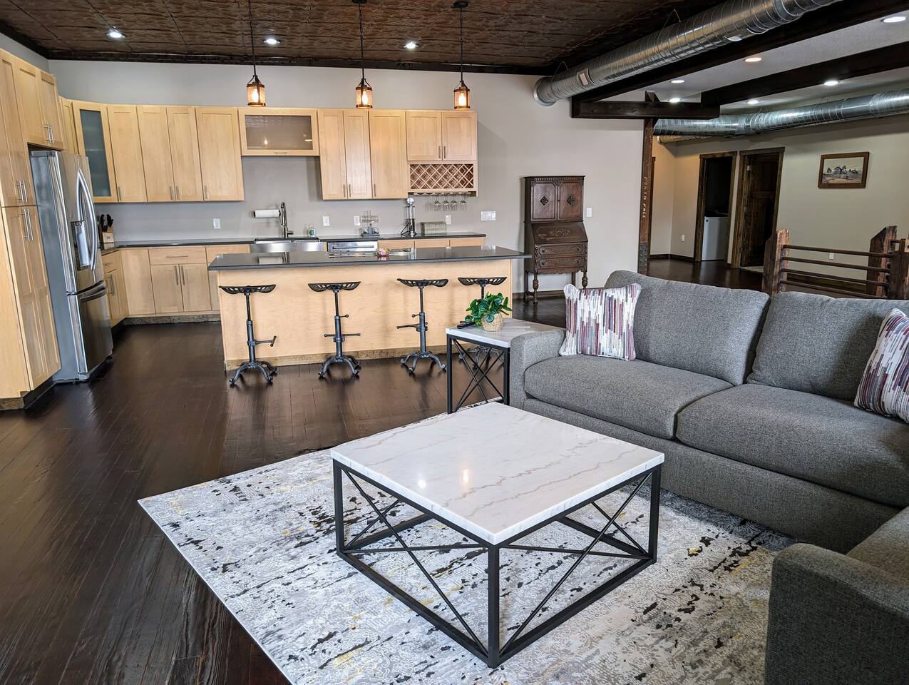 As you step inside, you're immediately greeted by the rustic elegance of exposed limestone walls and warm wood floors that whisper tales of days gone by. The high tin ceilings add a touch of grandeur, accentuating the spaciousness of the loft. Boasting two bedrooms and one bath, this loft offers a sanctuary for weary travelers or those seeking a retreat from the hustle and bustle of everyday life. The first bedroom, adorned with a sumptuous king bed and a twin over twin bunk bed, invites you to sink into its plush linens for a restful night's sleep. A large closet provides ample storage space, while a television offers entertainment at your fingertips. The second bedroom echoes the luxurious comfort of the first, with another king bed, a television, and a generous closet. Entertainment options abound in this historic haven. Two living rooms cater to different moods and activities, with one serving as a cozy retreat adorned with opulent furnishings, perfect for lounging and intimate gatherings. The other living room doubles as a game room, complete with a projector for movie nights and a thrilling array of arcade games including a classic Pacman machine and a basketball shooting game. Whether you're a gaming enthusiast or simply seeking some lighthearted fun, this space promises endless amusement. The front living room seamlessly flows into the open kitchen and dining area, creating an inviting space for socializing and culinary delights. The kitchen is a chef's dream, fully equipped with modern appliances and a large floating island with seating for four, where guests can gather to chat or indulge in delicious meals prepared with love. From casual breakfasts to gourmet dinners, this kitchen is sure to inspire culinary creativity. Convenience meets functionality with the inclusion of a dedicated laundry room, ensuring that chores are a breeze even during your getaway. Throughout the loft, thoughtful touches and attention to detail abound, making every moment a pleasure. Whether you're exploring the historic charm of the surrounding town, testing your luck at the nearby casino, perfecting your swing at the golf course, or unwinding by the tranquil shores of the nearby lake, your stay is sure to be an unforgettable experience, leaving you longing to return time and time again.