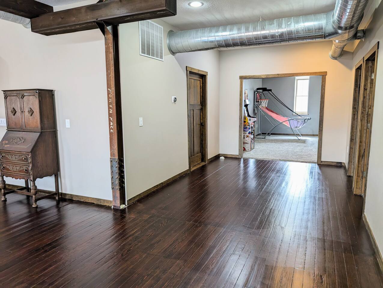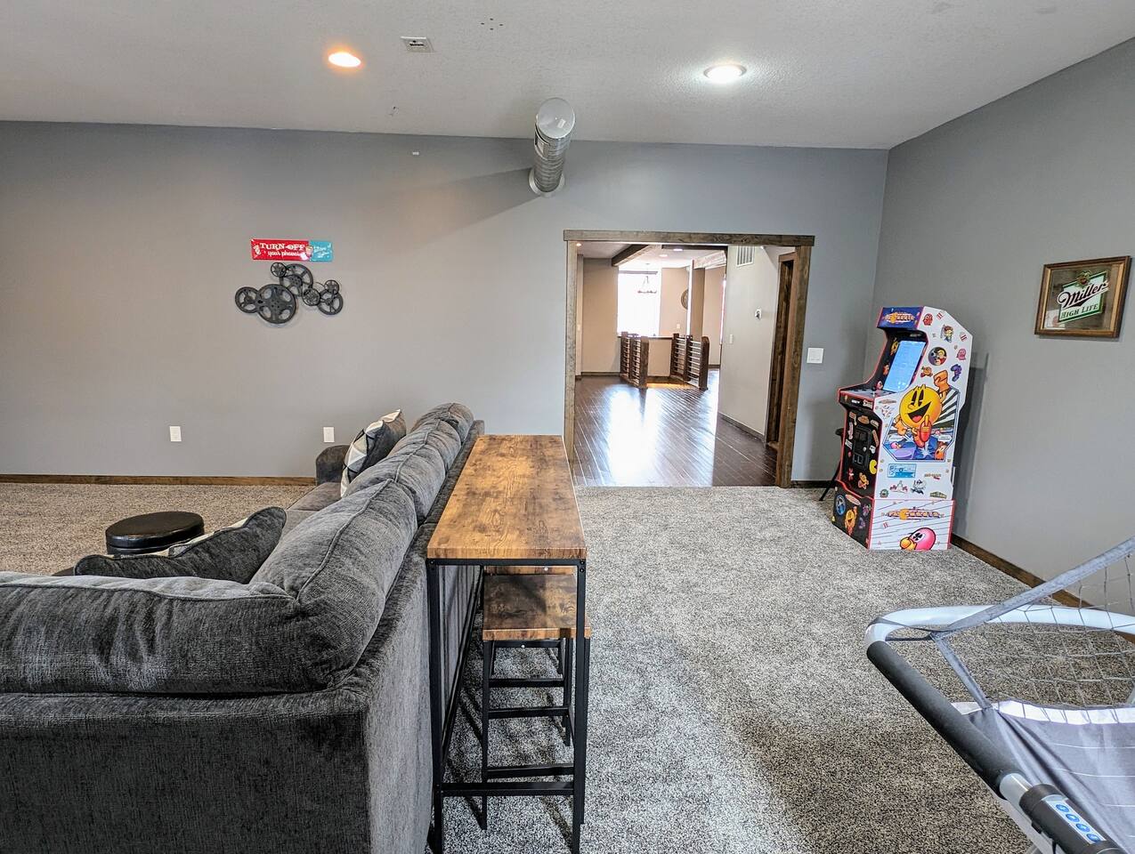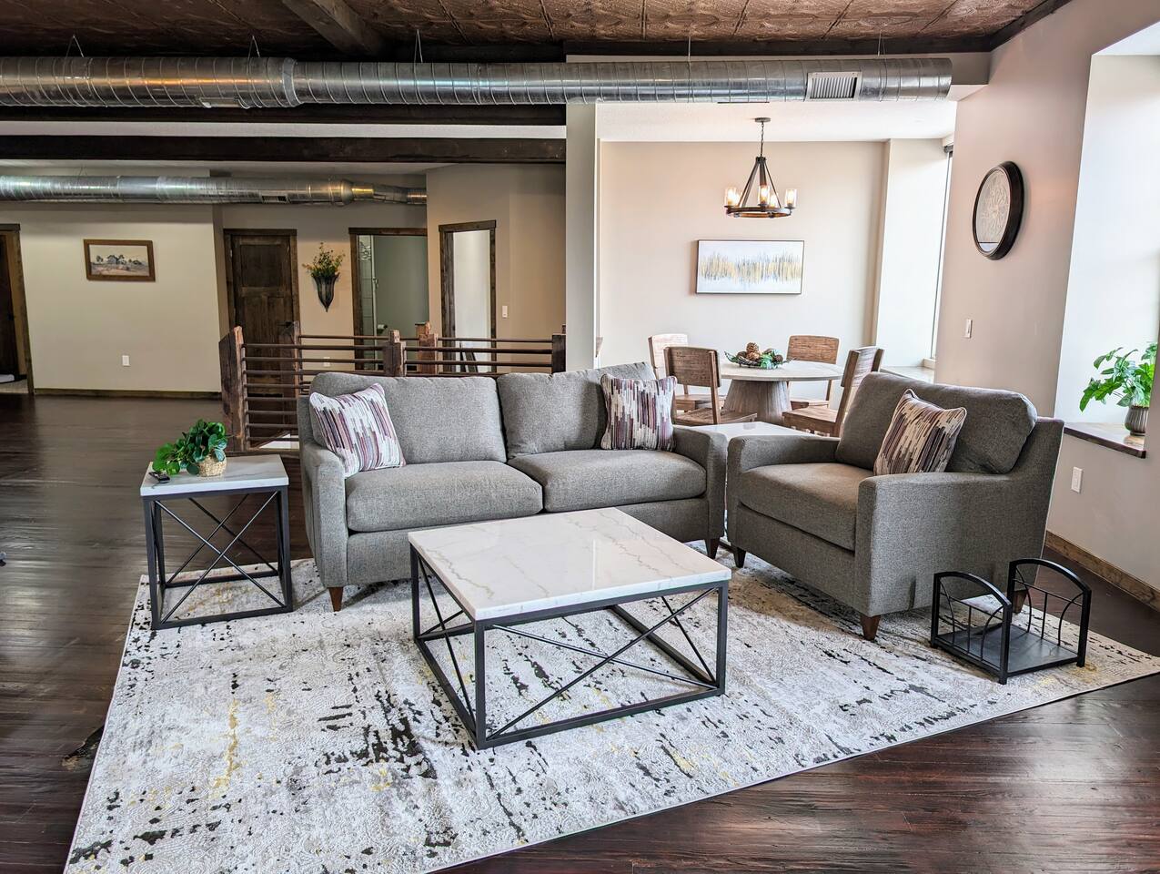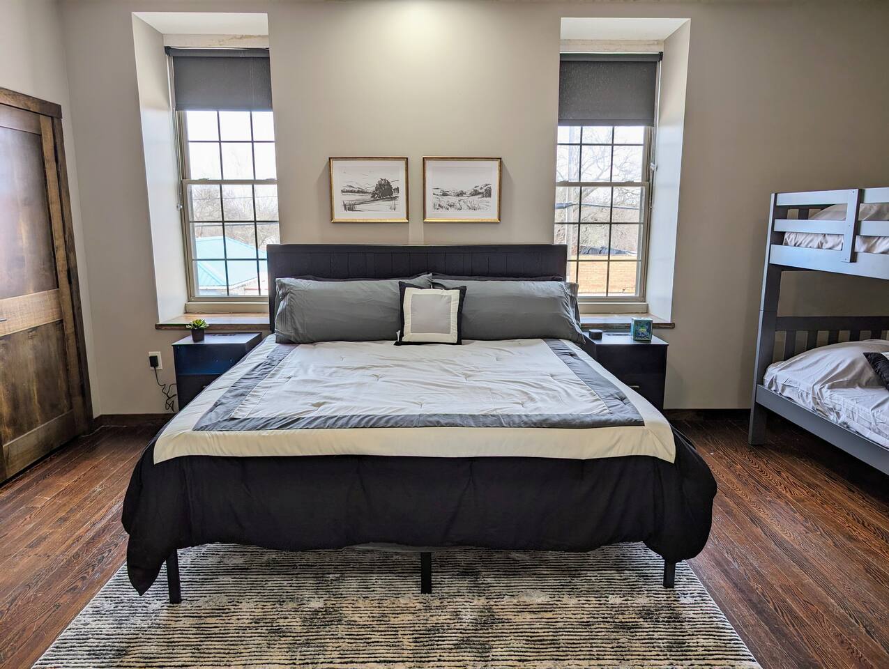 As you step inside, you're immediately greeted by the rustic elegance of exposed limestone walls and warm wood floors that whisper tales of days gone by. The high tin ceilings add a touch of grandeur, accentuating the spaciousness of the loft. Boasting two bedrooms and one bath, this loft offers a sanctuary for weary travelers or those seeking a retreat from the hustle and bustle of everyday life. The first bedroom, adorned with a sumptuous king bed and a twin over twin bunk bed, invites you to sink into its plush linens for a restful night's sleep. A large closet provides ample storage space, while a television offers entertainment at your fingertips. The second bedroom echoes the luxurious comfort of the first, with another king bed, a television, and a generous closet. Entertainment options abound in this historic haven. Two living rooms cater to different moods and activities, with one serving as a cozy retreat adorned with opulent furnishings, perfect for lounging and intimate gatherings. The other living room doubles as a game room, complete with a projector for movie nights and a thrilling array of arcade games including a classic Pacman machine and a basketball shooting game. Whether you're a gaming enthusiast or simply seeking some lighthearted fun, this space promises endless amusement. The front living room seamlessly flows into the open kitchen and dining area, creating an inviting space for socializing and culinary delights. The kitchen is a chef's dream, fully equipped with modern appliances and a large floating island with seating for four, where guests can gather to chat or indulge in delicious meals prepared with love. From casual breakfasts to gourmet dinners, this kitchen is sure to inspire culinary creativity. Convenience meets functionality with the inclusion of a dedicated laundry room, ensuring that chores are a breeze even during your getaway. Throughout the loft, thoughtful touches and attention to detail abound, making every moment a pleasure. Whether you're exploring the historic charm of the surrounding town, testing your luck at the nearby casino, perfecting your swing at the golf course, or unwinding by the tranquil shores of the nearby lake, your stay is sure to be an unforgettable experience, leaving you longing to return time and time again.
