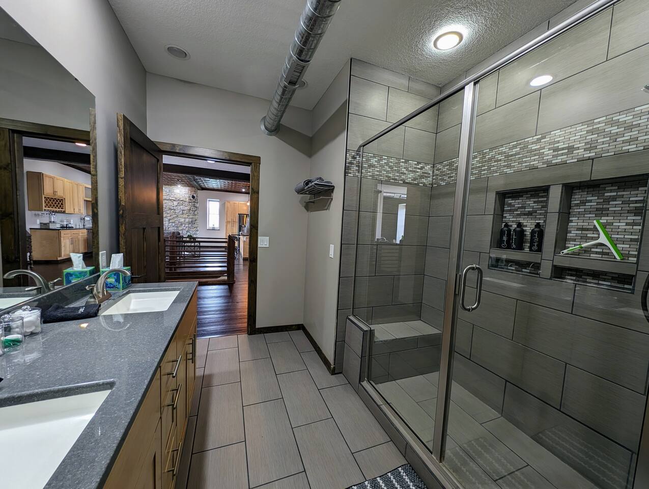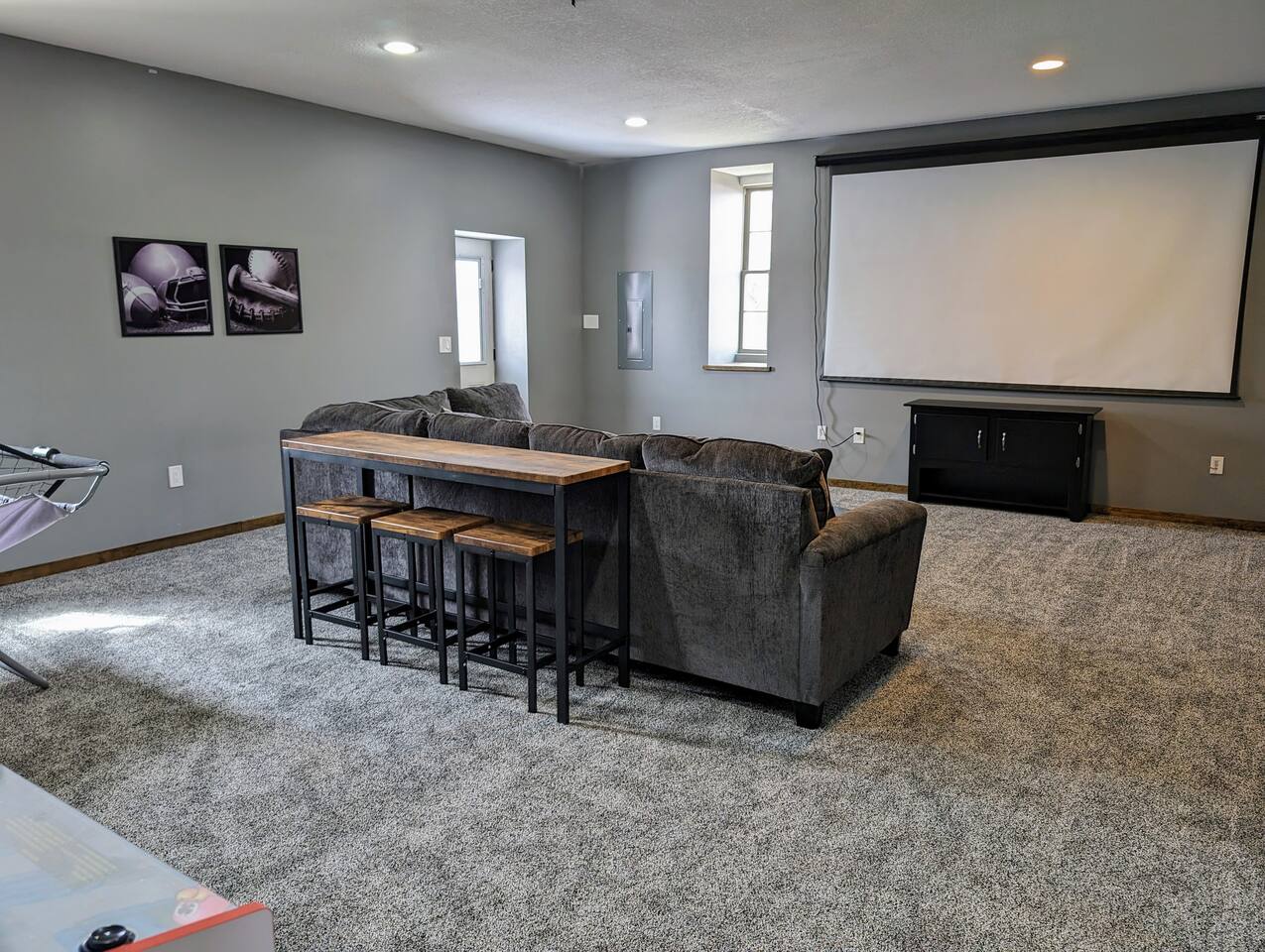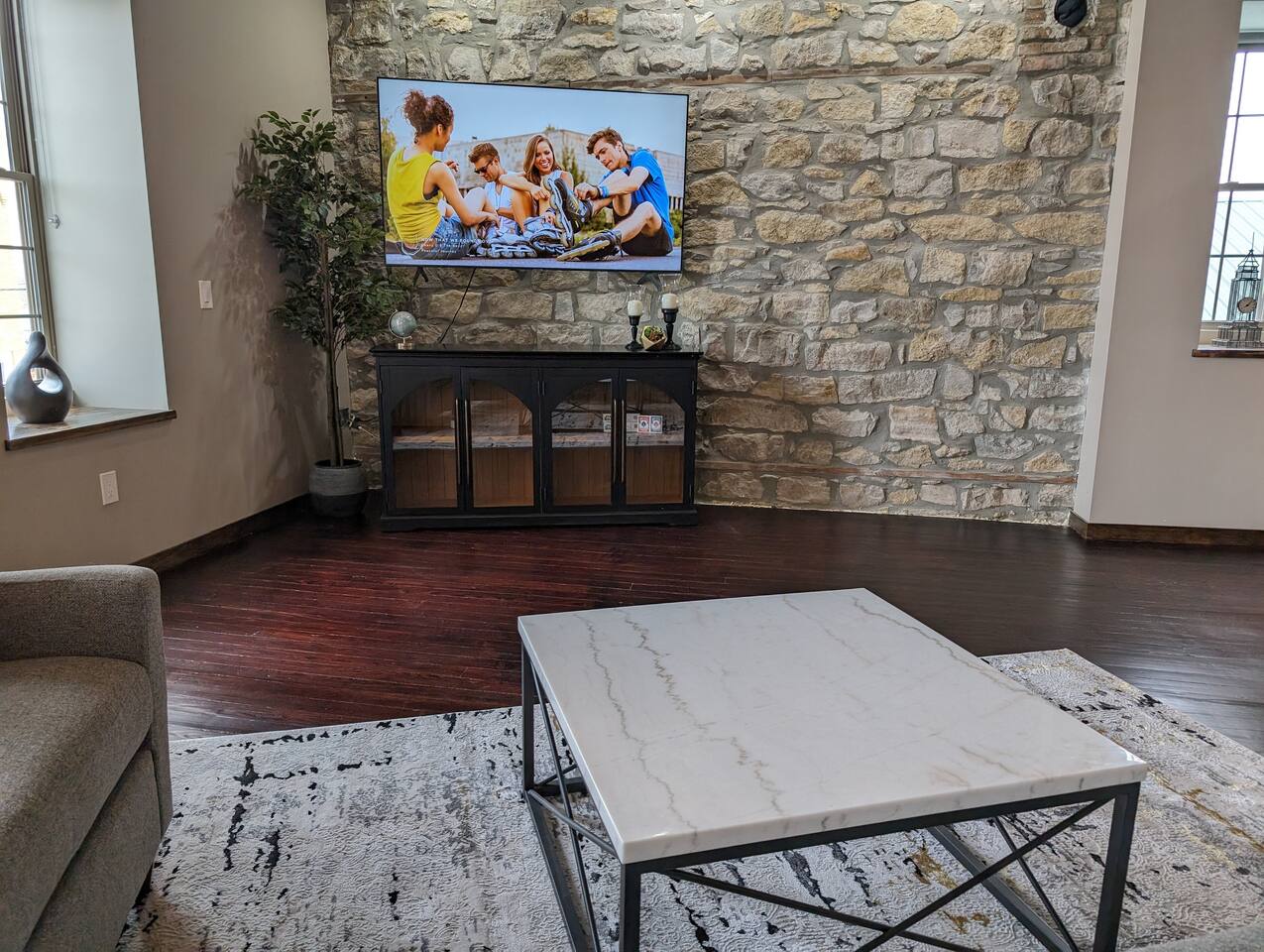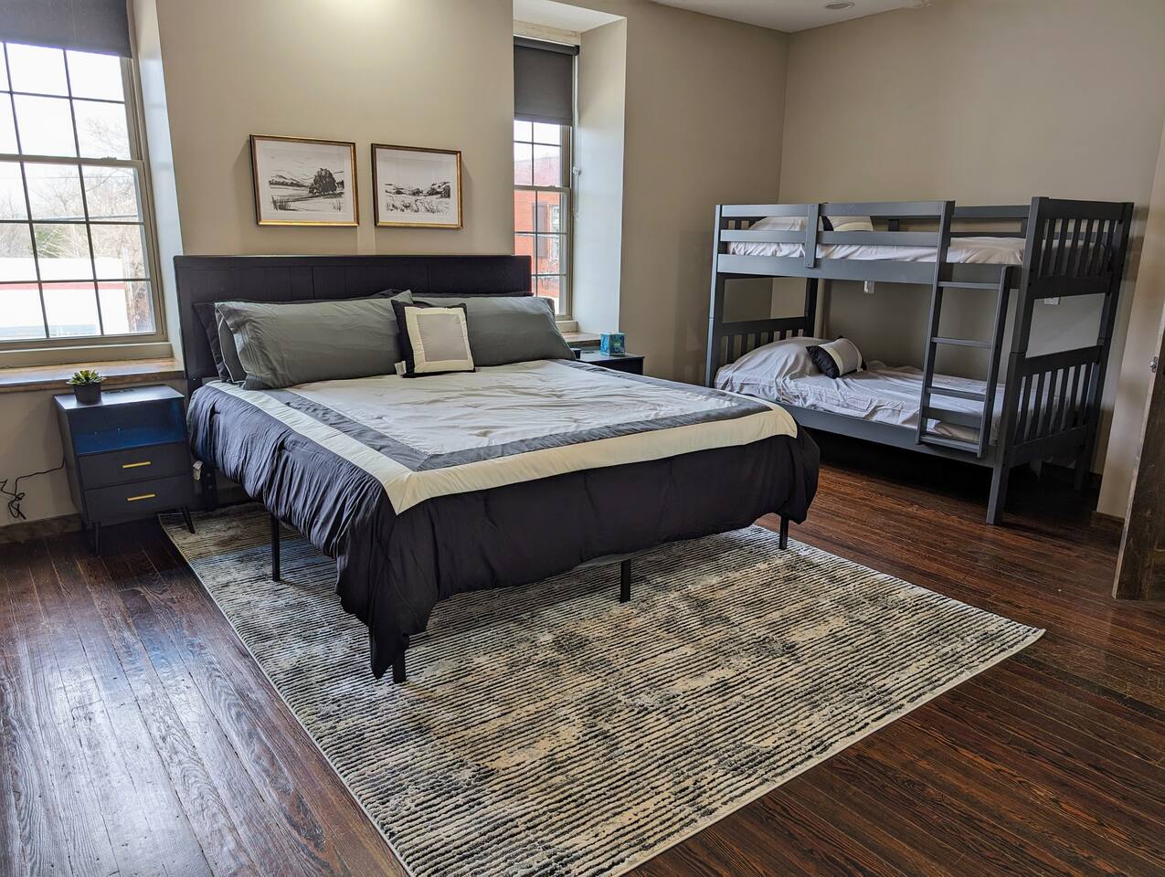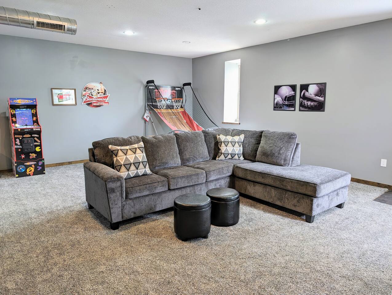 As you step inside, you're immediately greeted by the rustic elegance of exposed limestone walls and warm wood floors that whisper tales of days gone by. The high tin ceilings add a touch of grandeur, accentuating the spaciousness of the loft. Boasting two bedrooms and one bath, this loft offers a sanctuary for weary travelers or those seeking a retreat from the hustle and bustle of everyday life. The first bedroom, adorned with a sumptuous king bed and a twin over twin bunk bed, invites you to sink into its plush linens for a restful night's sleep. A large closet provides ample storage space, while a television offers entertainment at your fingertips. The second bedroom echoes the luxurious comfort of the first, with another king bed, a television, and a generous closet. Entertainment options abound in this historic haven. Two living rooms cater to different moods and activities, with one serving as a cozy retreat adorned with opulent furnishings, perfect for lounging and intimate gatherings. The other living room doubles as a game room, complete with a projector for movie nights and a thrilling array of arcade games including a classic Pacman machine and a basketball shooting game. Whether you're a gaming enthusiast or simply seeking some lighthearted fun, this space promises endless amusement. The front living room seamlessly flows into the open kitchen and dining area, creating an inviting space for socializing and culinary delights. The kitchen is a chef's dream, fully equipped with modern appliances and a large floating island with seating for four, where guests can gather to chat or indulge in delicious meals prepared with love. From casual breakfasts to gourmet dinners, this kitchen is sure to inspire culinary creativity. Convenience meets functionality with the inclusion of a dedicated laundry room, ensuring that chores are a breeze even during your getaway. Throughout the loft, thoughtful touches and attention to detail abound, making every moment a pleasure. Whether you're exploring the historic charm of the surrounding town, testing your luck at the nearby casino, perfecting your swing at the golf course, or unwinding by the tranquil shores of the nearby lake, your stay is sure to be an unforgettable experience, leaving you longing to return time and time again.