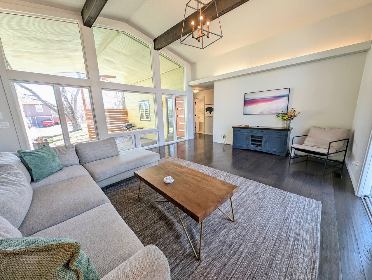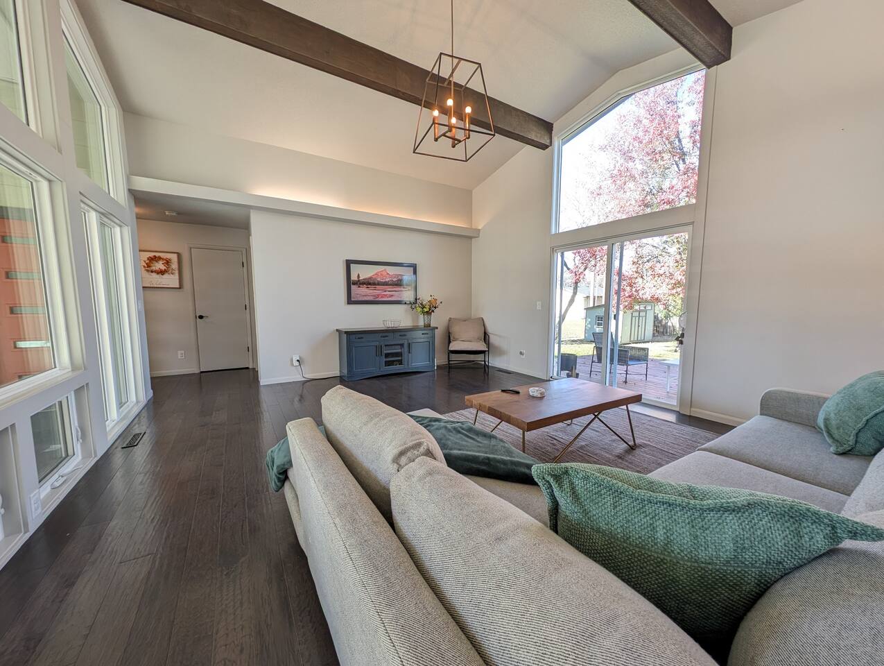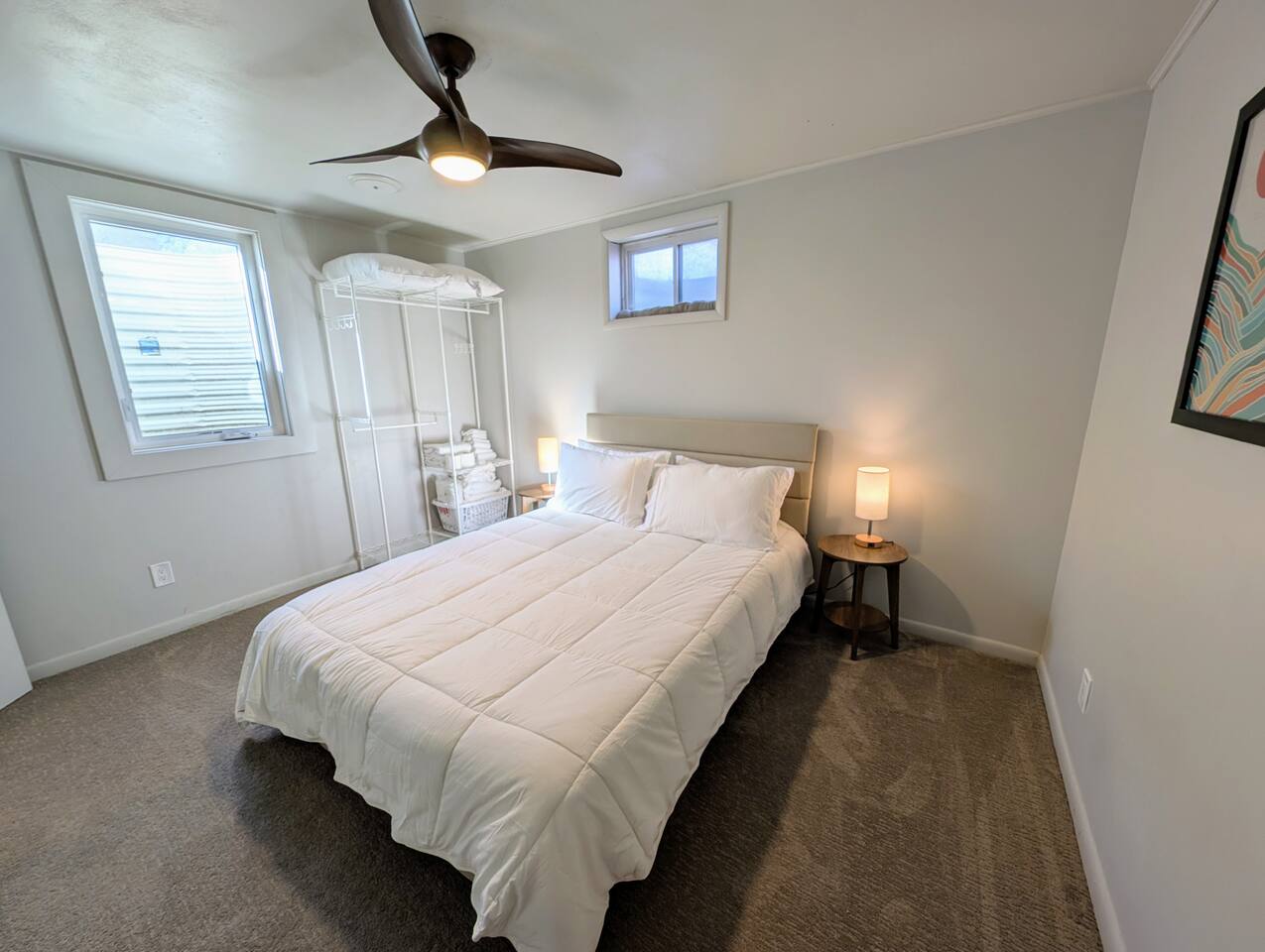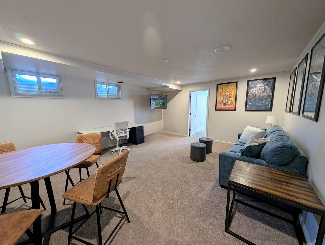 Experience the perfect blend of Mid-Century charm and modern elegance in this stunning home. Boasting expansive windows and vaulted ceilings, the open-concept kitchen, dining, and living area is filled with natural light and features a spacious sectional for relaxation. The main floor offers two cozy bedrooms with queen beds and a fully renovated bathroom, complete with a stylish tub and shower combo. The beautifully finished basement provides additional space, including a second living area with a queen sleeper sofa, a desk, and a dining table perfect for games or work. You’ll also find a bedroom with a queen bed, a small bathroom with a shower, and a convenient laundry room. This home combines comfort, style, and functionality—ideal for a memorable stay!