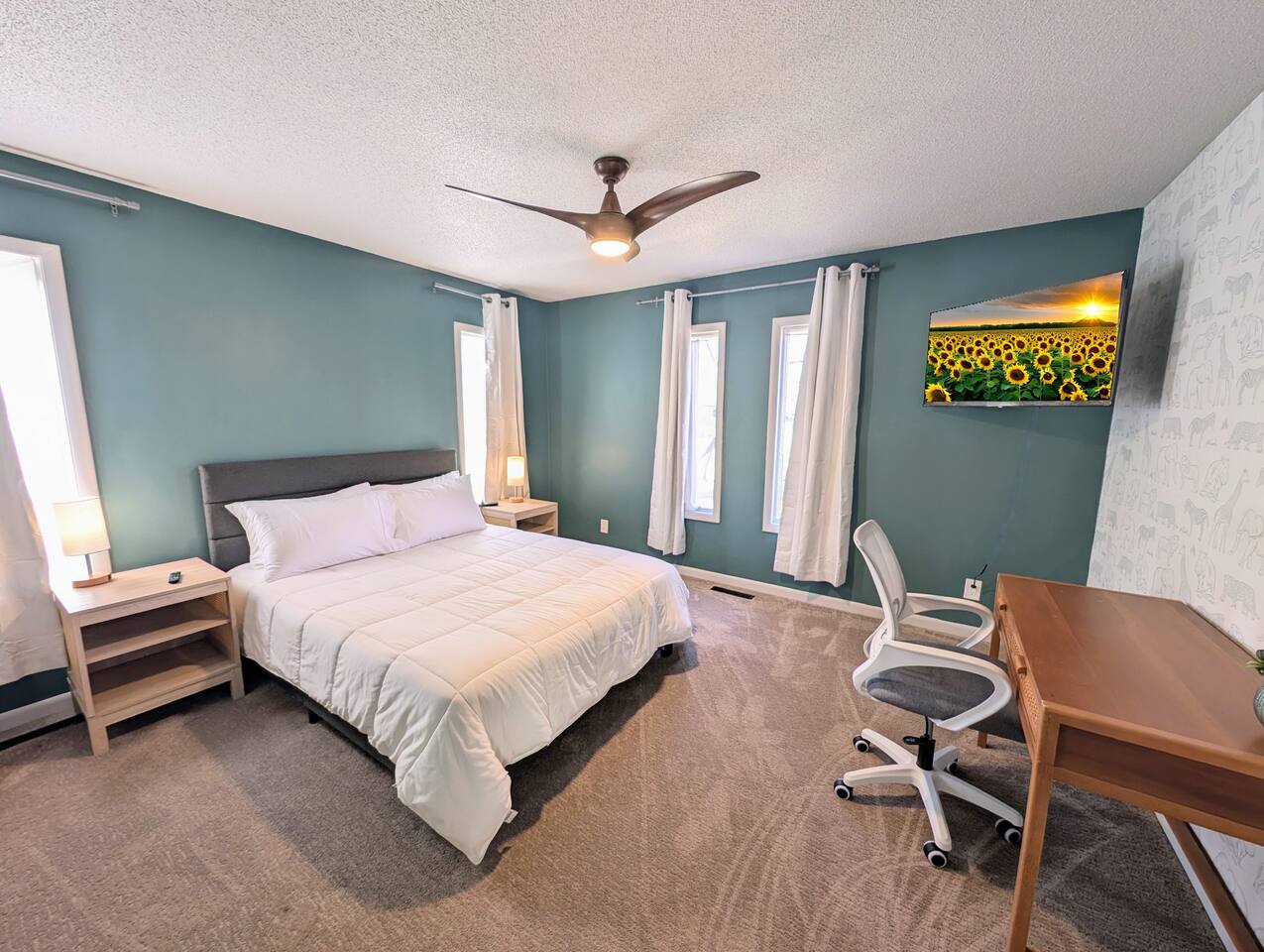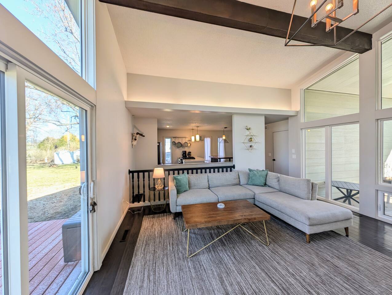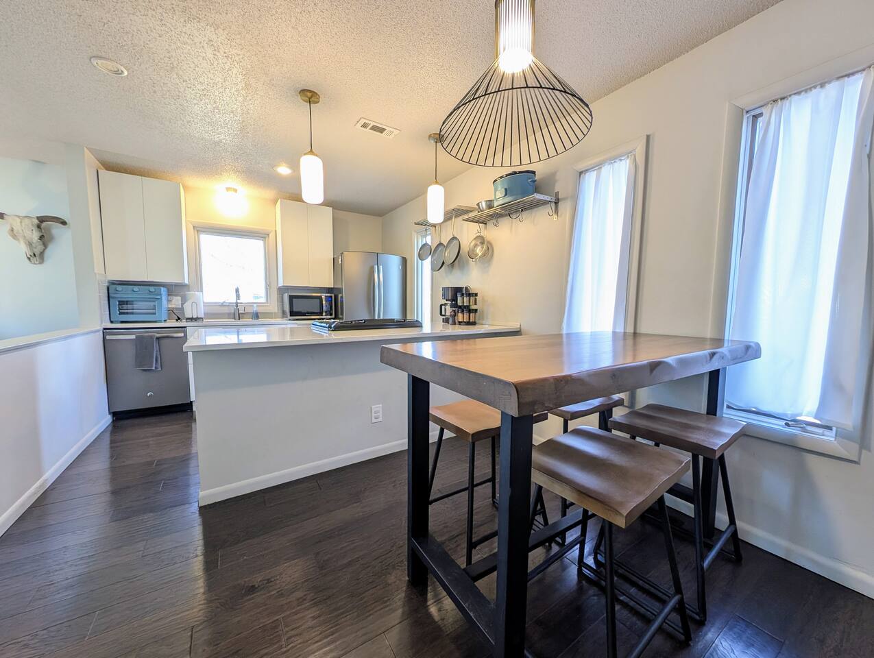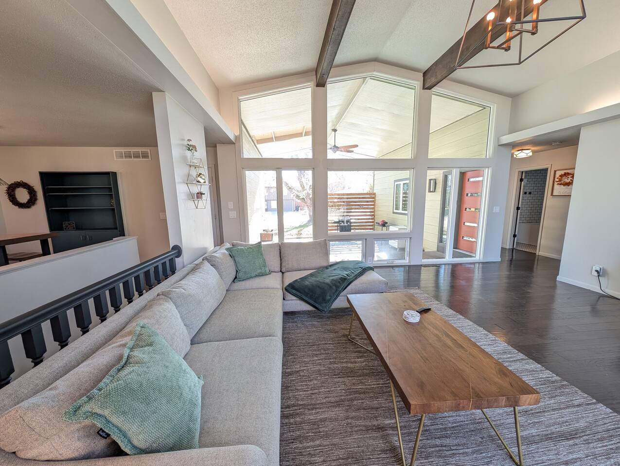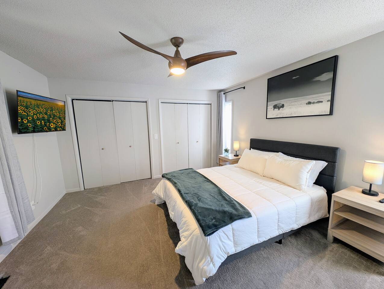 Experience the perfect blend of Mid-Century charm and modern elegance in this stunning home. Boasting expansive windows and vaulted ceilings, the open-concept kitchen, dining, and living area is filled with natural light and features a spacious sectional for relaxation. The main floor offers two cozy bedrooms with queen beds and a fully renovated bathroom, complete with a stylish tub and shower combo. The beautifully finished basement provides additional space, including a second living area with a queen sleeper sofa, a desk, and a dining table perfect for games or work. You’ll also find a bedroom with a queen bed, a small bathroom with a shower, and a convenient laundry room. This home combines comfort, style, and functionality—ideal for a memorable stay!
