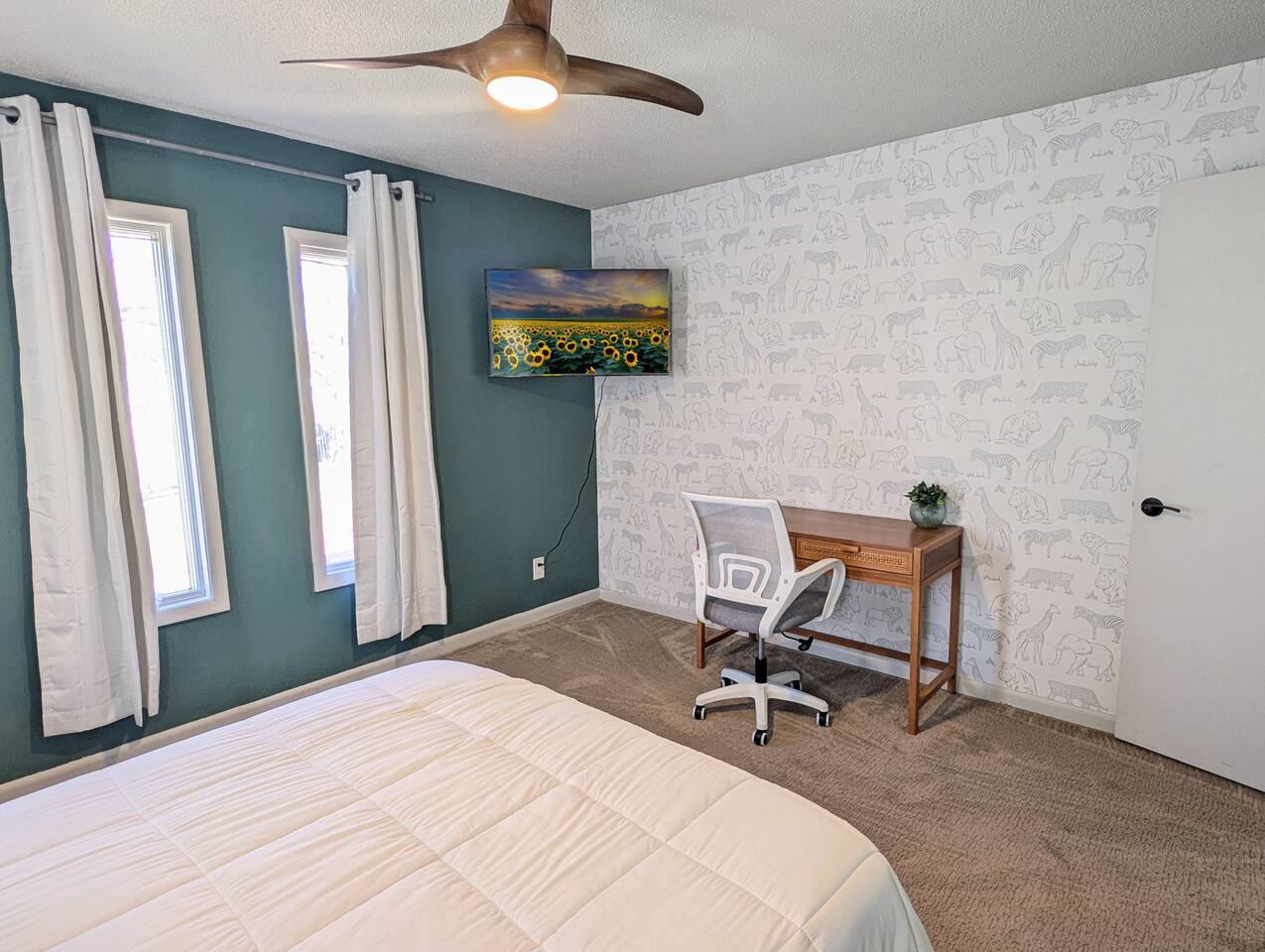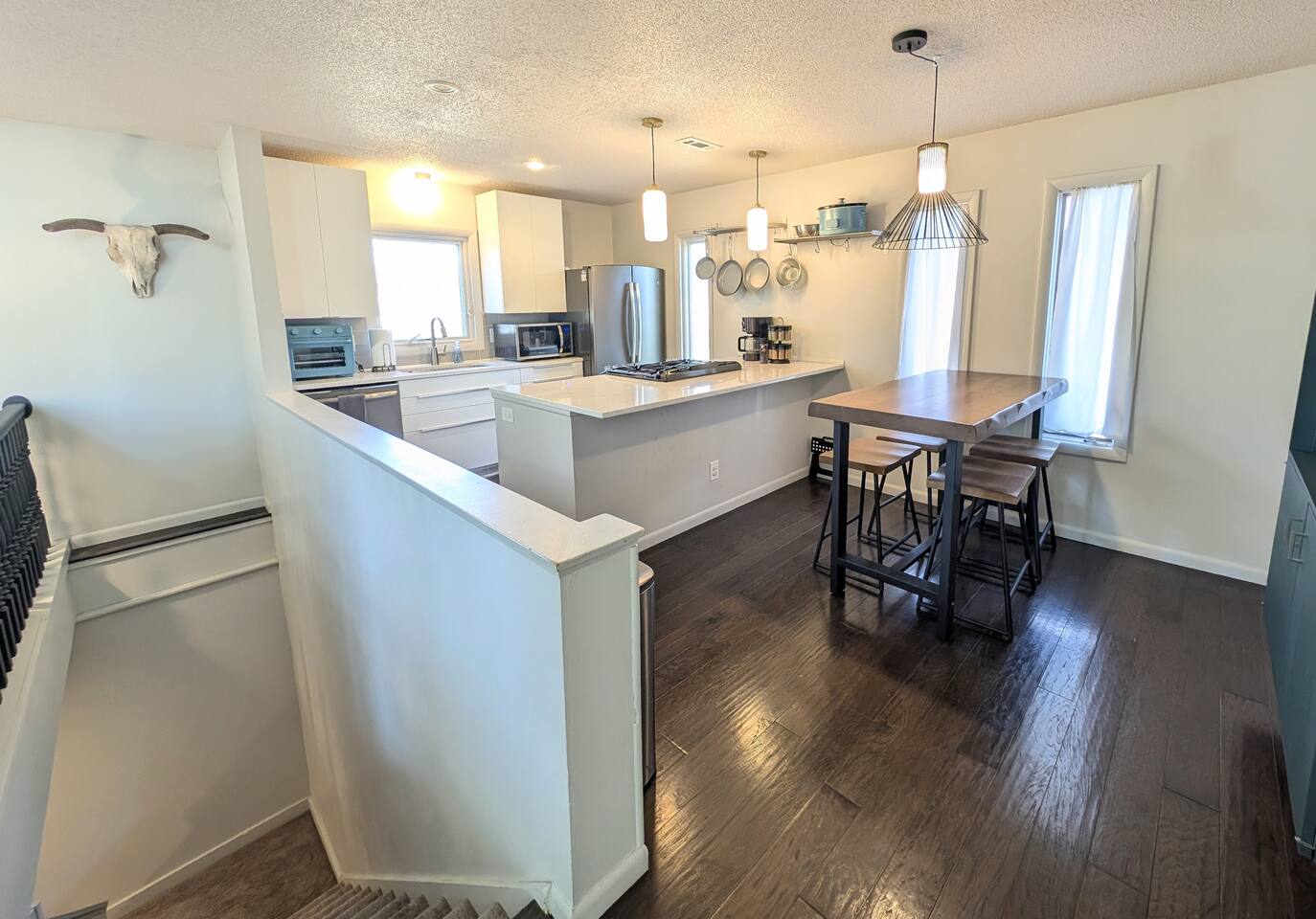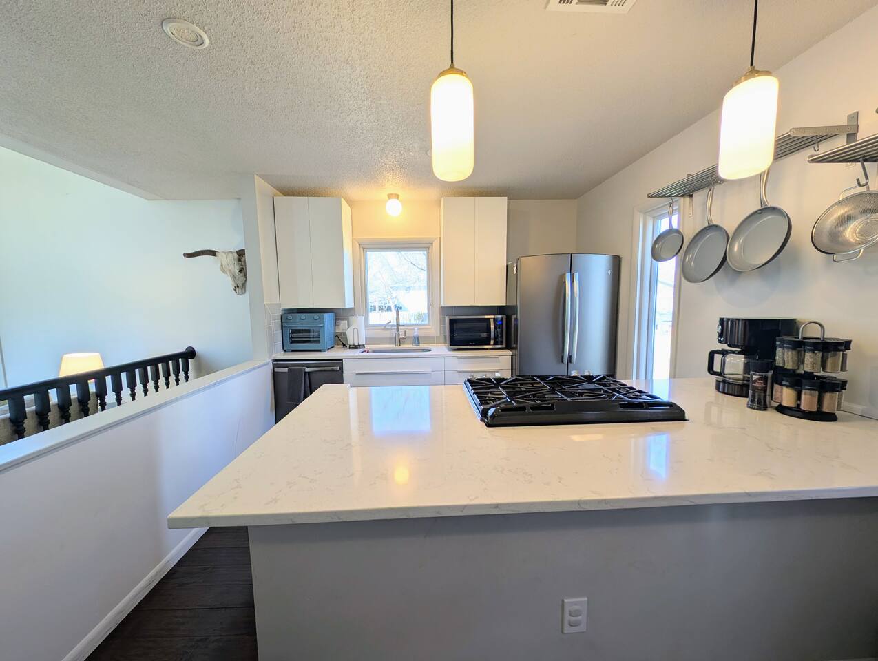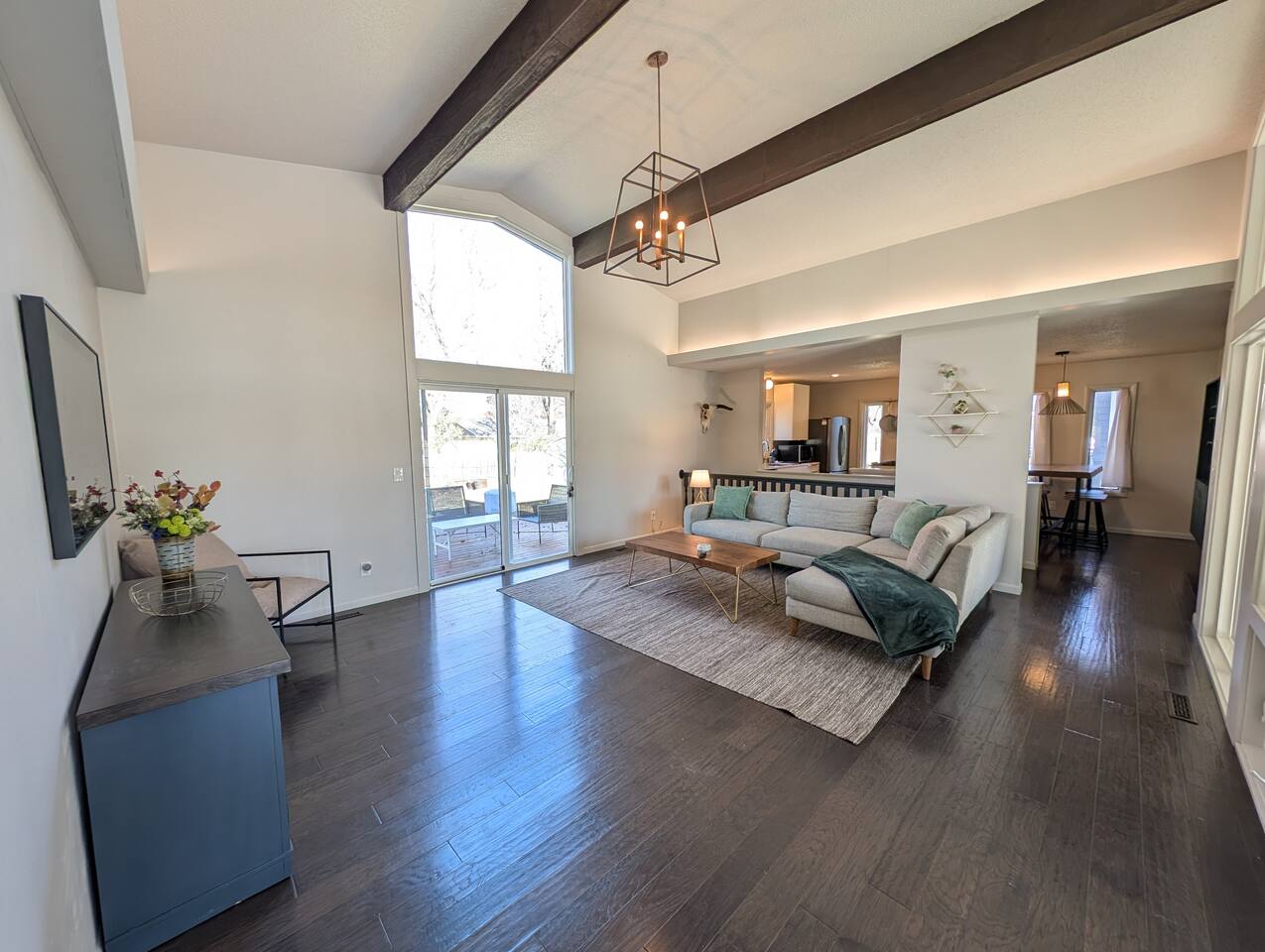 Experience the perfect blend of Mid-Century charm and modern elegance in this stunning home. Boasting expansive windows and vaulted ceilings, the open-concept kitchen, dining, and living area is filled with natural light and features a spacious sectional for relaxation. The main floor offers two cozy bedrooms with queen beds and a fully renovated bathroom, complete with a stylish tub and shower combo. The beautifully finished basement provides additional space, including a second living area with a queen sleeper sofa, a desk, and a dining table perfect for games or work. You’ll also find a bedroom with a queen bed, a small bathroom with a shower, and a convenient laundry room. This home combines comfort, style, and functionality—ideal for a memorable stay!