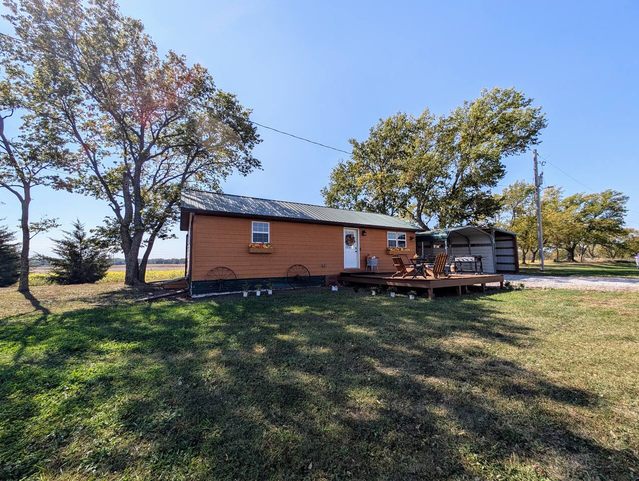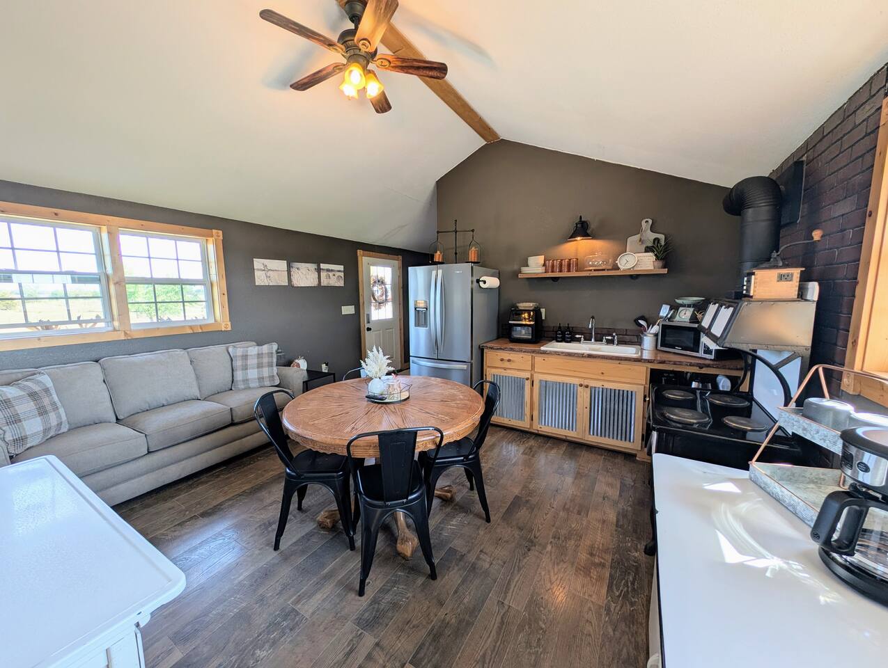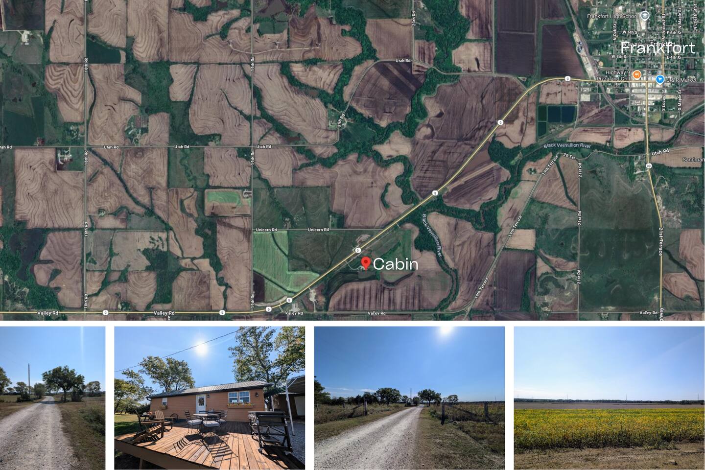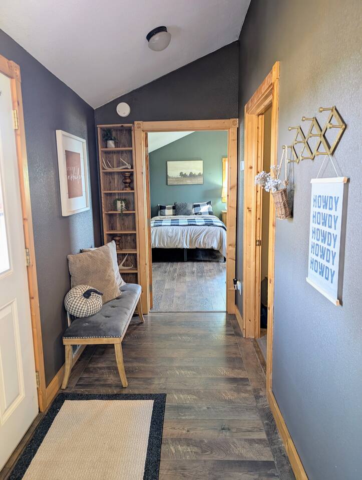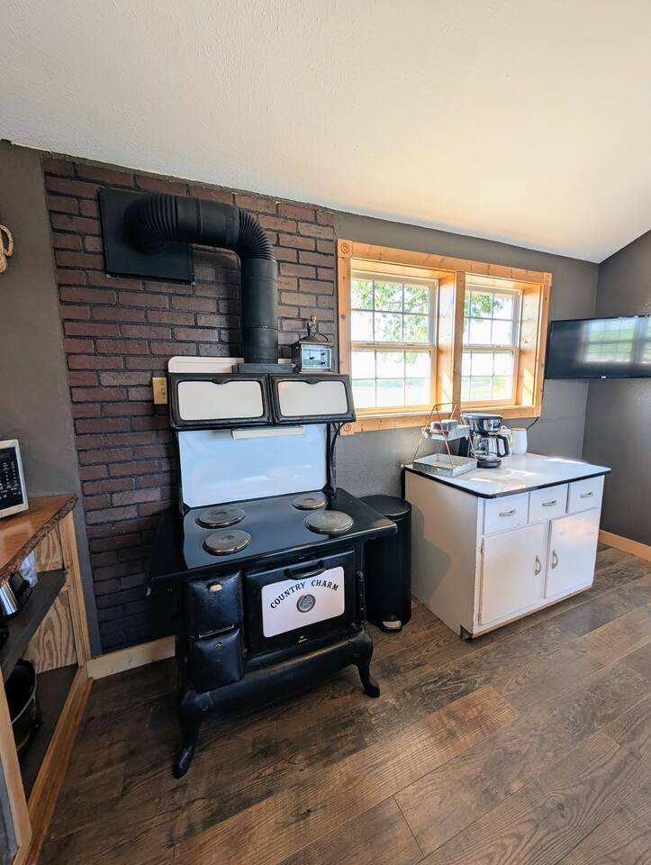 Just 5 minutes from Frankfort, KS, this beautifully renovated cabin offers serene views for miles. The spacious bedroom features two queen beds, while the open living/dining area is stylish and inviting. Relax on the large front porch, perfect for sipping coffee or enjoying meals. Trendy yet tranquil, this small cabin is your calming escape