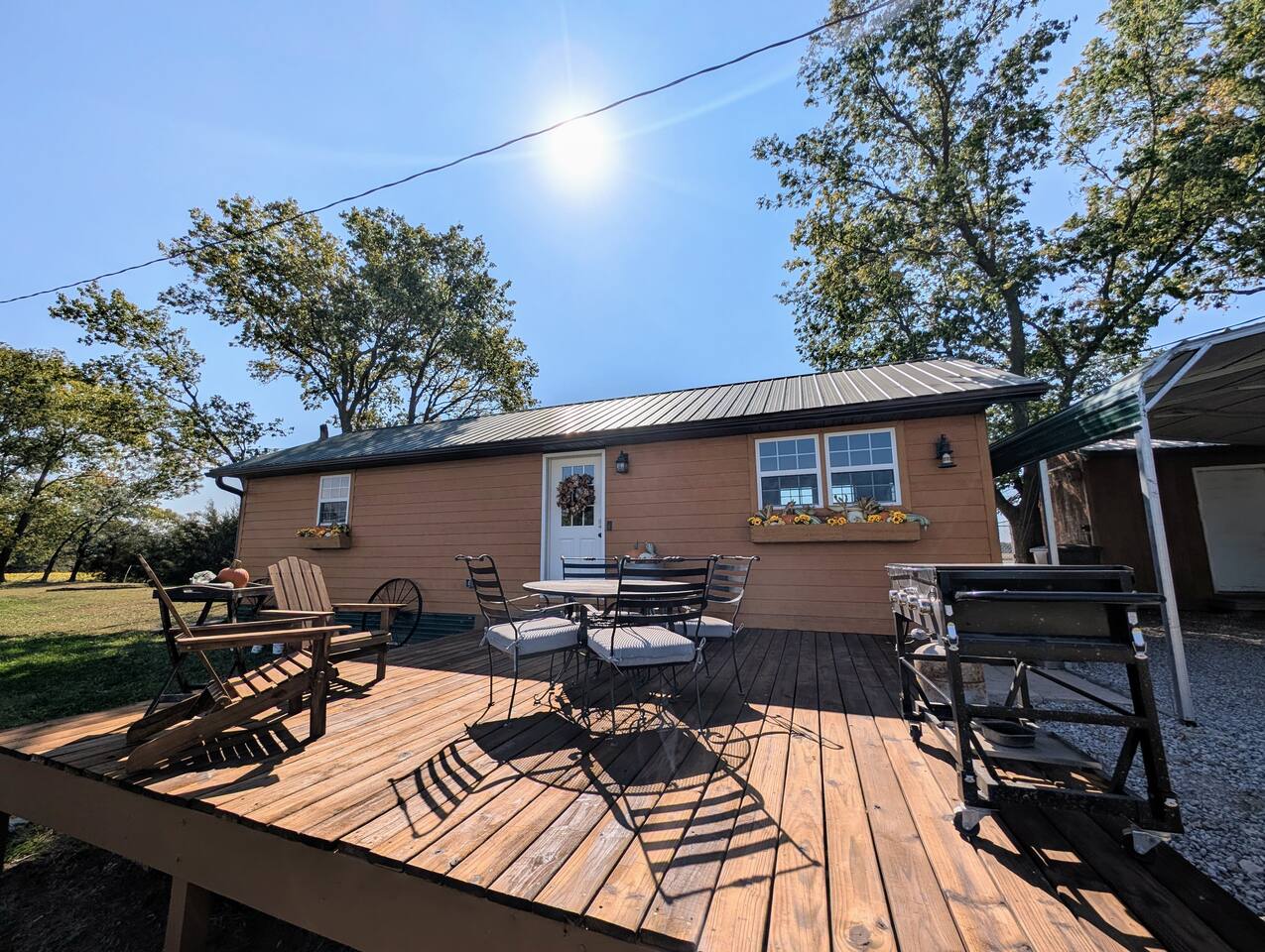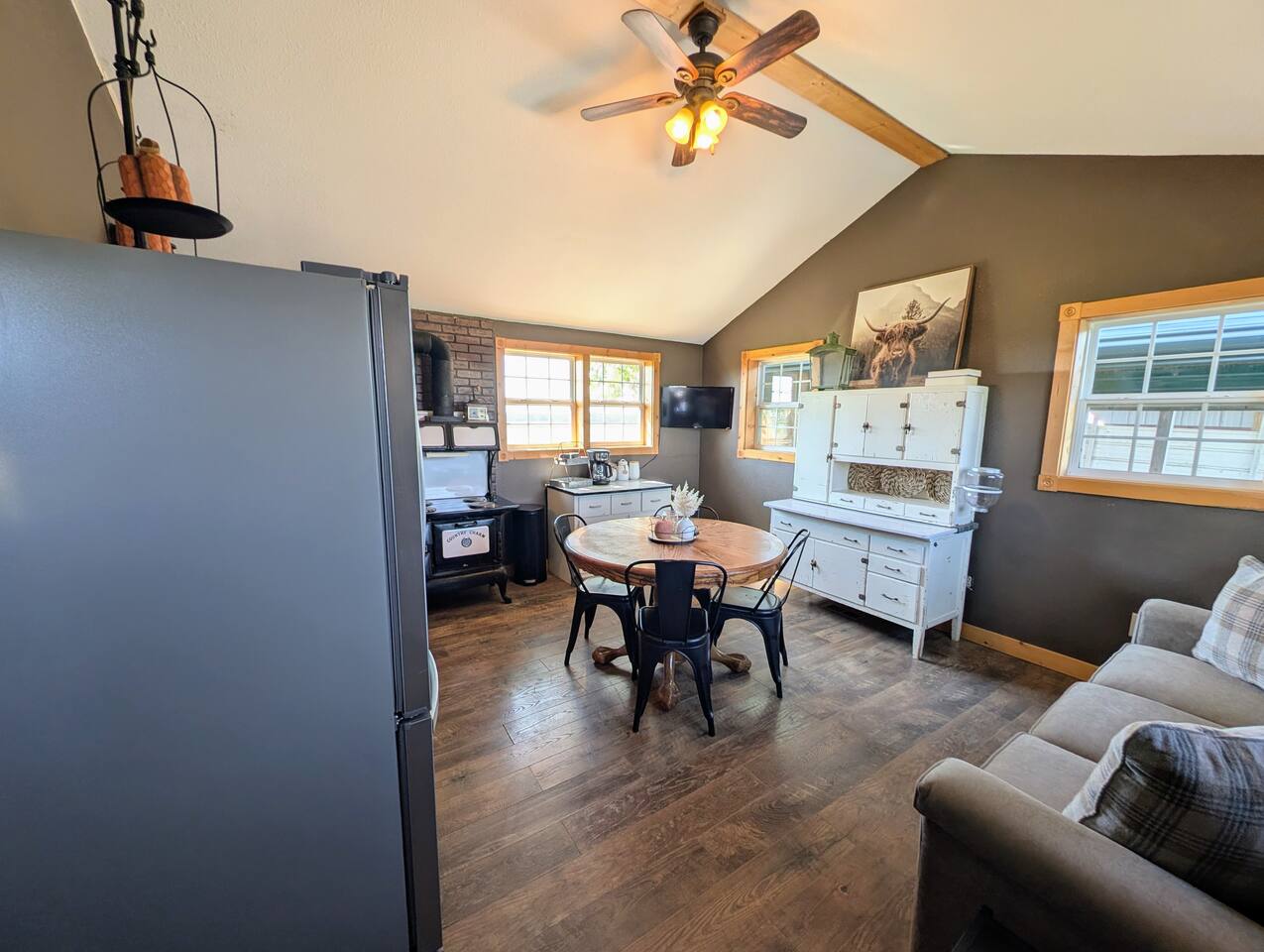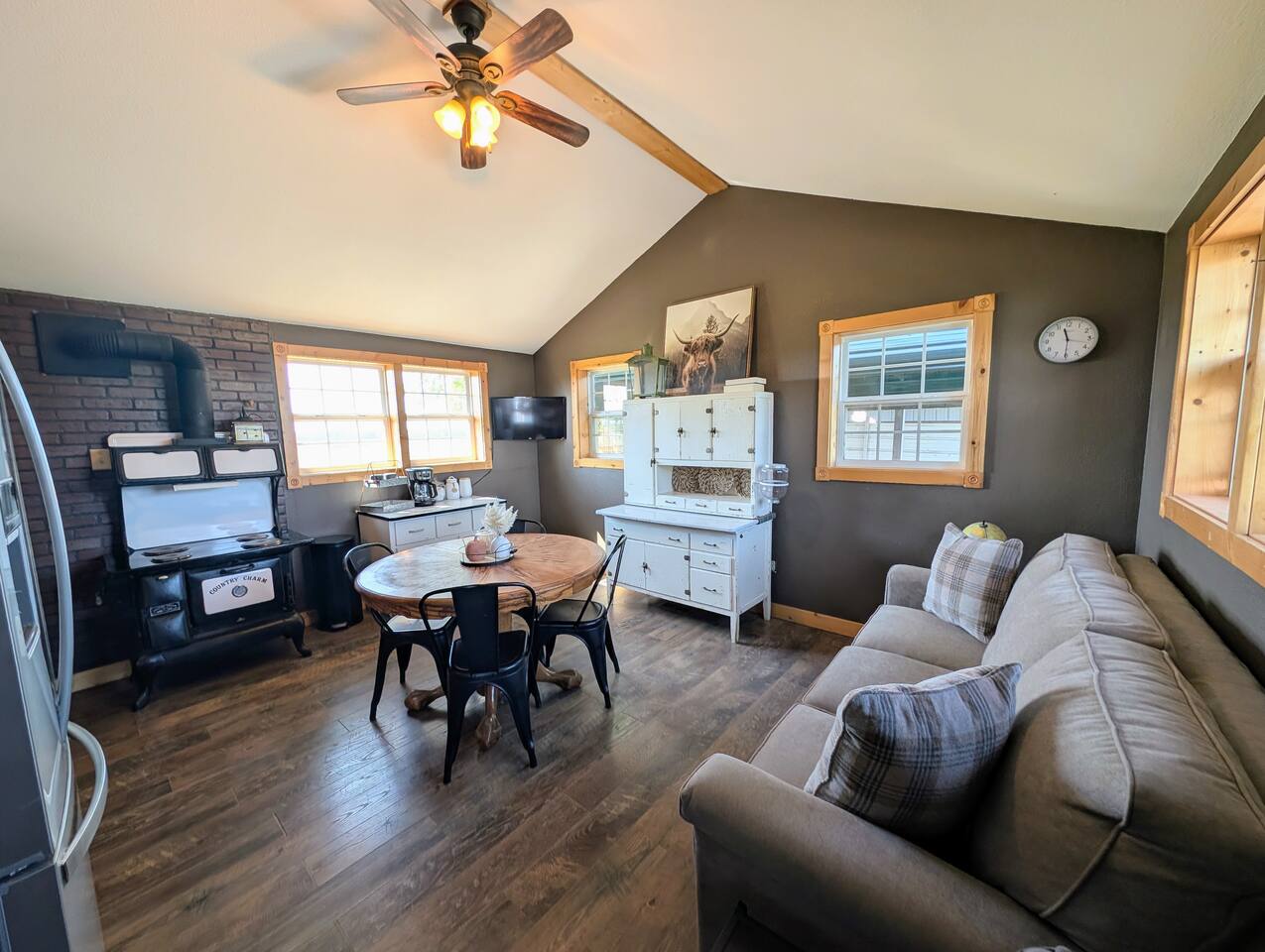 Just 5 minutes from Frankfort, KS, this beautifully renovated cabin offers serene views for miles. The spacious bedroom features two queen beds, while the open living/dining area is stylish and inviting. Relax on the large front porch, perfect for sipping coffee or enjoying meals. Trendy yet tranquil, this small cabin is your calming escape